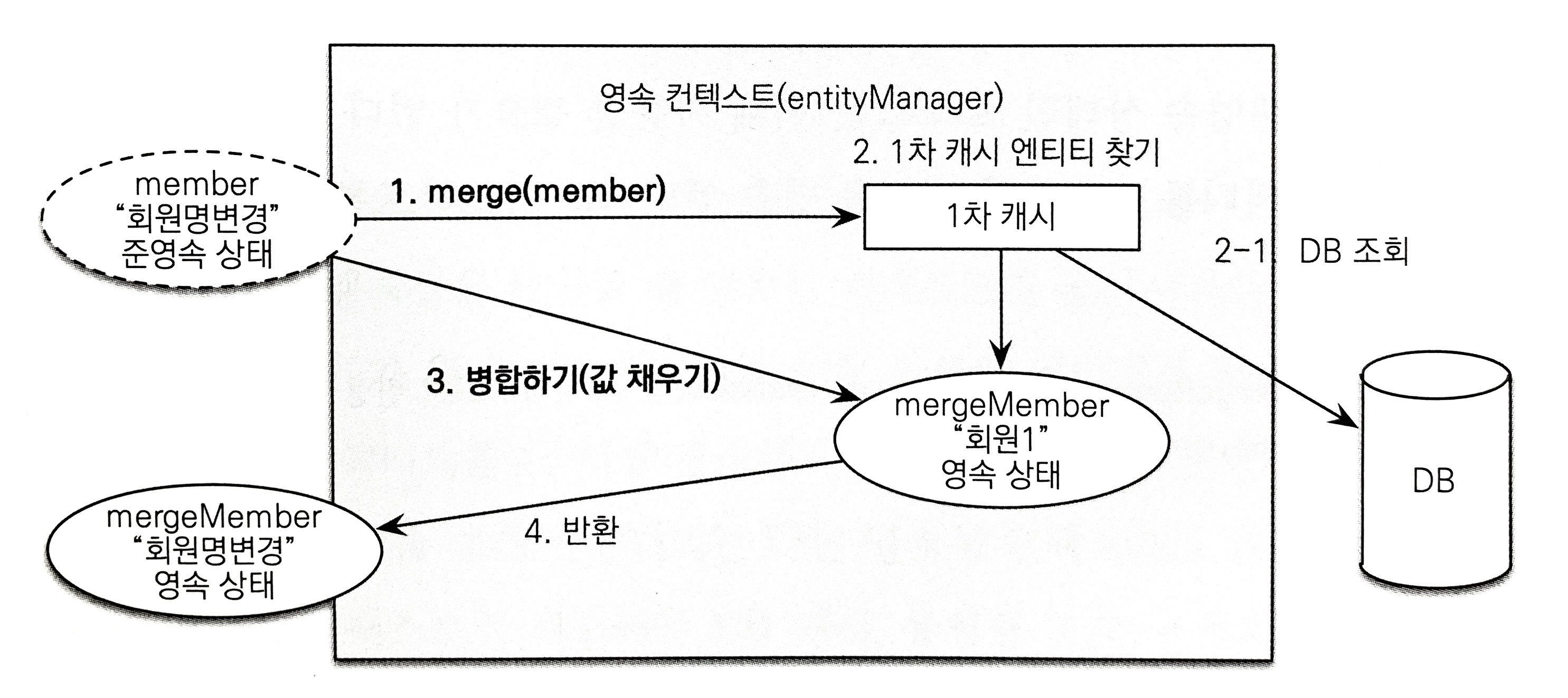 - 준영속 엔티티의 식별자 값으로 1차 캐시에서 엔티티를 조회한다. 만약 1차 캐시에 엔티티가 없으면 데이터베이스에서 엔티티를 조회하여 1차 캐시에 저장한다.