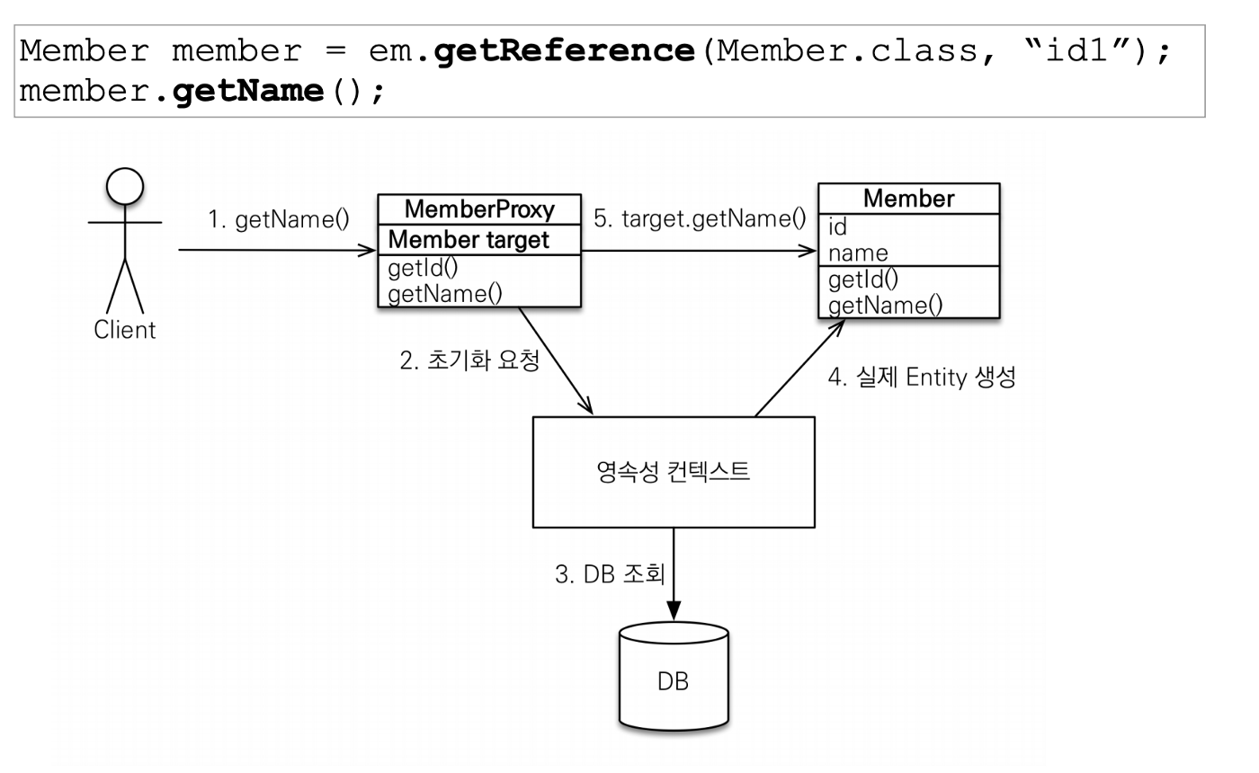 - 영속성 컨텍스트에 찾는 엔티티가 이미 있으면 데이터베이스를 조회할 필요가 없으므로 em.getReference()를 호출해도 프록시가 아닌 실제 엔티티를 반환한다.